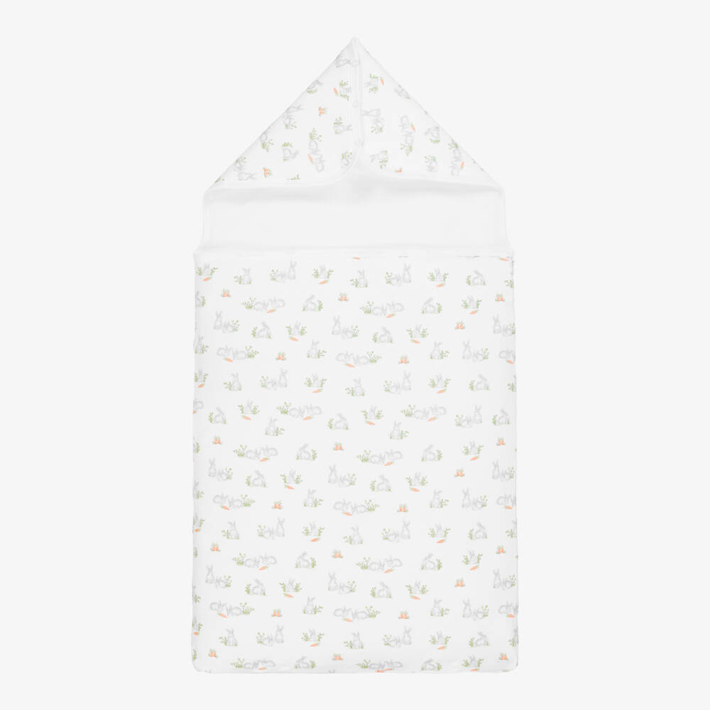 Exclusive to Childrensalon, a white nest for baby boys and girls by Kissy Kissy, with an adorable bunny pattern. It is made in beautifully soft Pima cotton jersey and lightly padded for comfort and warmth. It fastens on the side with a zip and has a popper-fastening hood which can be opened and laid flat.