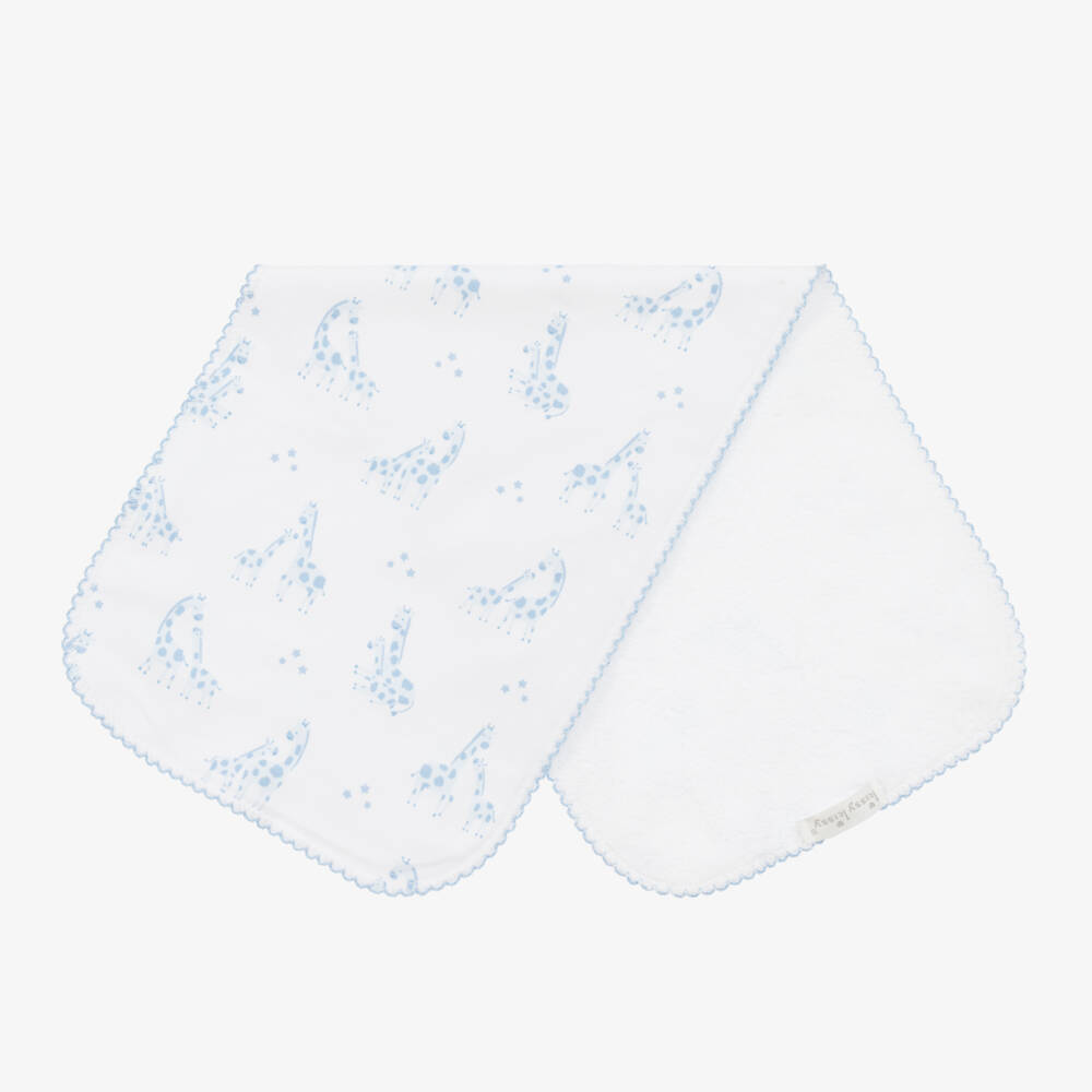 Lovely white burp cloth for baby boys by Kissy Kissy, with a cute pale blue giraffe pattern. It is made in beautifully soft Pima cotton jersey with an absorbent cotton towelling backing and a sweet blue picot embroidery trim. This useful feeding accessory can be placed over the shoulder when burping your baby and used for wiping those little spills after a feed.