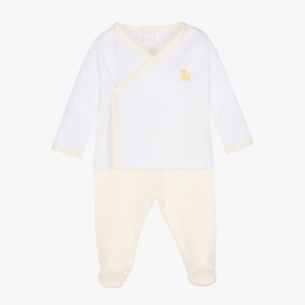 White and yellow two-piece babygrow for boys and girls by Kissy Kissy, made in super soft and stretchy Pima cotton jersey. The cross-over top fastens with a popper and button and has yellow and white striped trims. It has a cute hand-embroidered duckling on the chest and smaller sizes have useful fold-over scratch mitts. The matching yellow and white striped bottoms have an elasticated waist for a comfortable fit.
