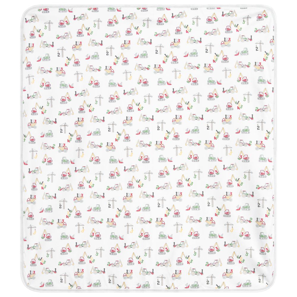White blanket by Kissy Kissy for baby boys and girls. It is made in a double layer of super soft Pima cotton jersey, with a cute construction-themed print in red, yellow and green.