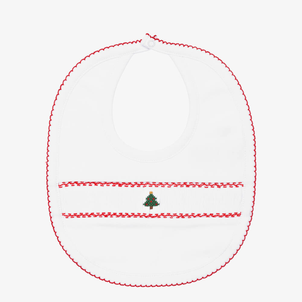 Baby girls and boys white bib by Kissy Kissy, made in a double layer of soft Pima cotton jersey. It is decorated with a hand smocking panel across the front and a lovely green and red Christmas tree embroidery. It has a sweet red embroidered border and a popper fastening on the back.