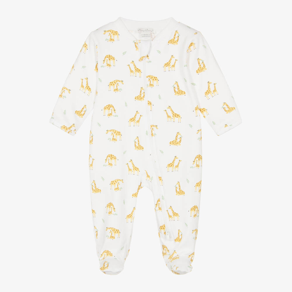 Sweet white babygrow for boys and girls by Kissy Kissy, with a cute giraffe print. Made in super soft, comfortable Pima cotton jersey, it has an easy-to-use zip fastening on the front with a protective chin guard and useful fold-over scratch mitts on the smaller sizes.