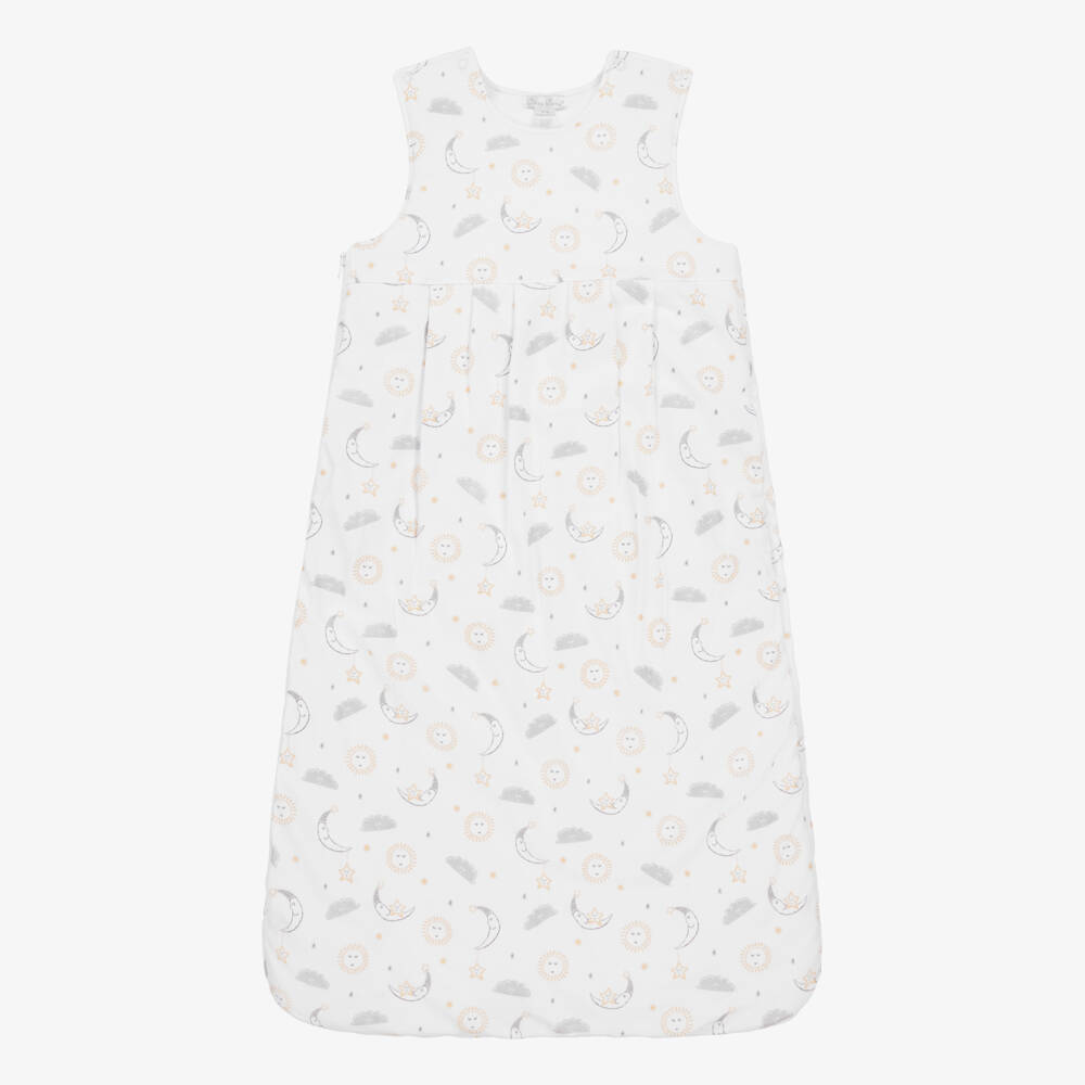 Beautifully soft white sleeping bag for baby boys and girls by Kissy Kissy, made in gentle Pima cotton jersey. Patterned with a yellow and grey starry moon print, this lovely accessory is padded for comfort and cosiness with a 3.0 Tog rating. To help get baby in and out easily, there is a smooth zip fastening along the side and popper fastenings on the straps.
