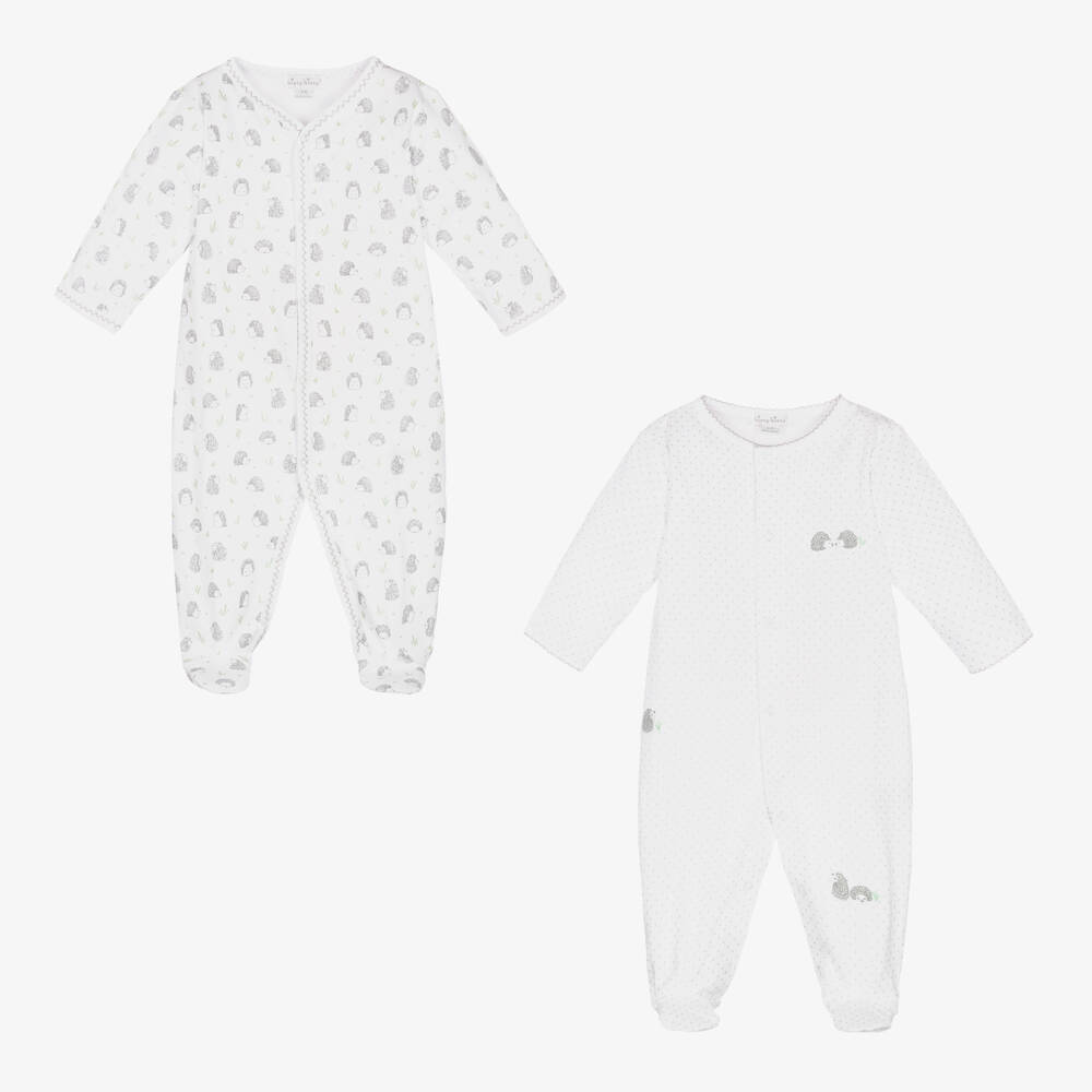 Adorable pack of two babygrows for boys and girls from Kissy Kissy, made in beautifully soft and gentle Pima cotton jersey. Kind and gentle against baby's delicate skin, one has tiny grey polka dots and embroidered hedgehogs on the chest and the other has an all-over hedgehog print in grey and green. For quick and easy dressing, both babysuits fastens with poppers on the front.