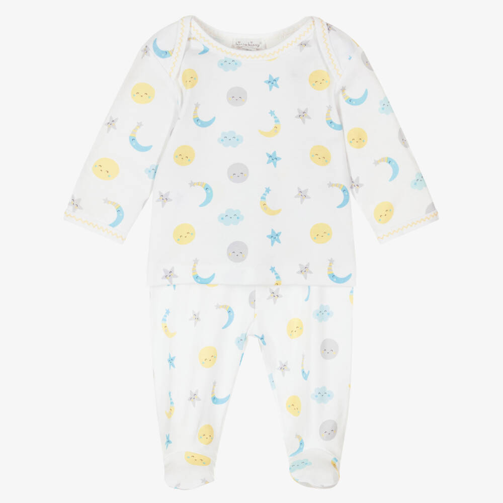 Lovely white two piece babygrow for boys and girls by Kissy Kissy, made in super soft and stretchy Pima cotton jersey. Kind and gentle against delicate skin, it has a cute blue and yellow smiling moons and stars print with sweet yellow trims. The top has an envelope neck for easy dressing and smaller sizes have useful fold-over scratch mitts. The matching bottoms have a gently elasticated waist for a comfortable fit.