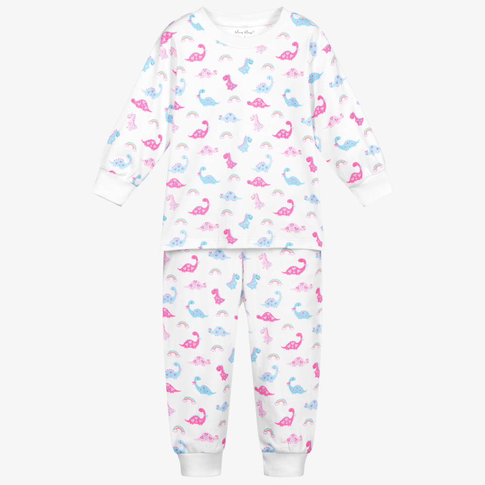 White Pima cotton pyjamas for girls by Kissy Kissy, with a cute pink and blue dinosaur print. They have white trims and the bottoms have an elasticated waist.