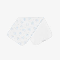 A white burp cloth for baby boys and girls by Kissy Kissy, patterned with cute giraffes and trimmed with delicate yellow embroidery. Ideal for placing over the shoulder when burping baby, it is made in soft Pima cotton jersey and lined in absorbent towelling.