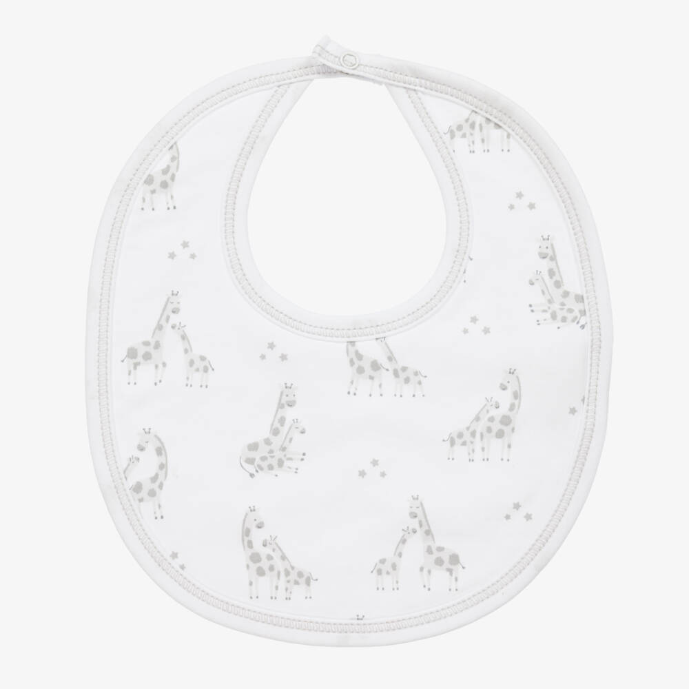 White and pale grey bib for baby boys and girls by Kissy Kissy, patterned with friendly little giraffes and stars. Trimmed with stitching, it is made in super-soft Pima cotton jersey, with a fluffy towelling underside for absorbency. This easy-to-secure bib has a popper on the back of the neck.