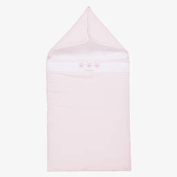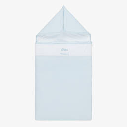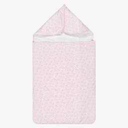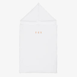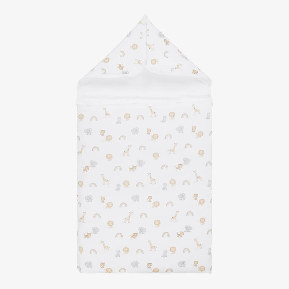 Exclusive to Childrensalon, a white nest for baby boys and girls by Kissy Kissy, patterned with safari animals in beige and grey. Made in super soft Pima cotton jersey, it is lightly padded for warmth, with a zip fastening on one side. There are popper fastenings on the hood, so it can be opened out to be used as a soft surface on which to lay baby.