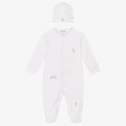 White babygrow and hat set for boys and girls by Kissy Kissy, made in super soft Pima cotton jersey. Both pieces are embroidered with an adorable yellow duckling and have yellow picot trims. The babygrow fastens with concealed poppers on the front and between the legs for speedy dressing, and has useful, fold-over scratch mitts on smaller sizes. The lined hat has a turned-up brim and simply pulls on. Ideal as a gift, the set comes in an organza pouch.