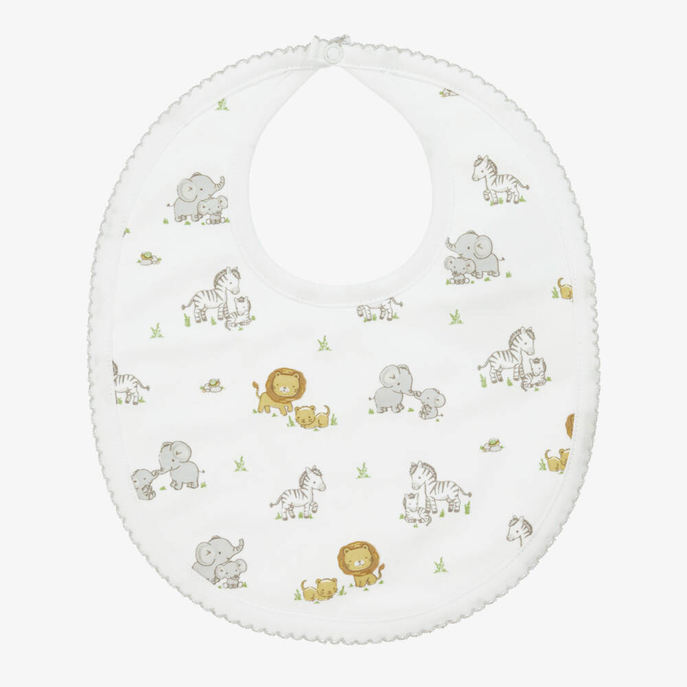 White bib for baby boys and girls by Kissy Kissy. It is patterned in a sweet jungle animal print in beige and grey, with picot embroidery trim. Made in super soft Pima cotton jersey, it has an absorbent towelling lining and fastens with a single popper.