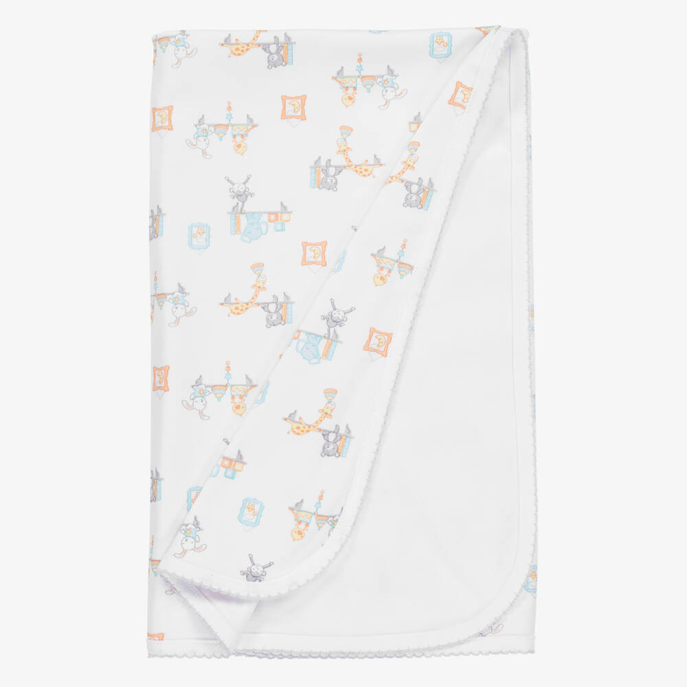 White blanket for baby boys and girls by Kissy Kissy, made in a double layer of super soft Pima cotton jersey. The front has a cute nursery-themed animal print in lovely pastel shades. It is plain on the reverse and has grey picot embroidered trims. A versatile nursery accessory, it can be used to wrap around baby or when out and about in the pram.