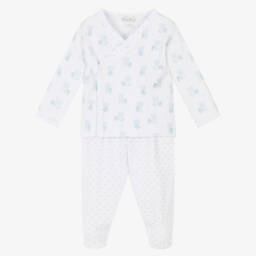Yellow and white two-piece babygrow for boys and girls by Kissy Kissy, made in the softest Pima cotton jersey. Gentle against delicate skin, the top has a cute hand-embroidered duck family on the chest, with yellow and white striped trims. The cross-over style top fastens with a button and popper on the front and smaller sizes have fold-over scratch mitts. The striped bottoms have an elasticated waistband for comfortable wear.
