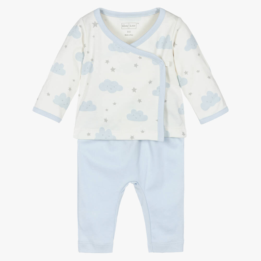 Blue and ivory trouser set for boys by Kissy Love. Made in soft Pima cotton jersey, it is kind and gentle on delicate skin. The lovely wrap-over top is patterned with an adorable blue cloud and grey star print all-over. It fastens effortlessly with poppers for convenient dressing. Smaller sizes have useful fold-over scratch mitts. The co-ordinated blue bottoms have a gently elasticated waist for a comfortable fit.