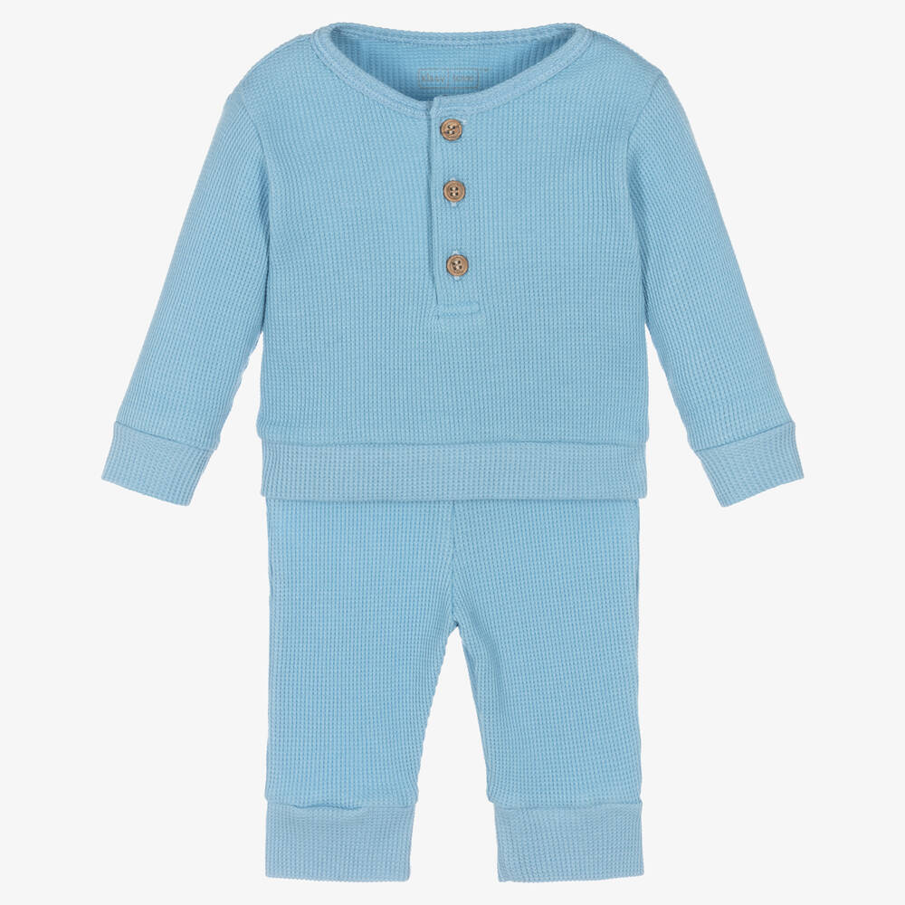 Lovely blue trouser set for baby boys by Kissy Love, made in super soft and stretchy Pima cotton jersey. Kind and gentle against delicate skin, this cute set is made in a sky blue waffle jersey. The top has wooden effect button fastenings on the front and the trousers have a comfortable elasticated waistband.