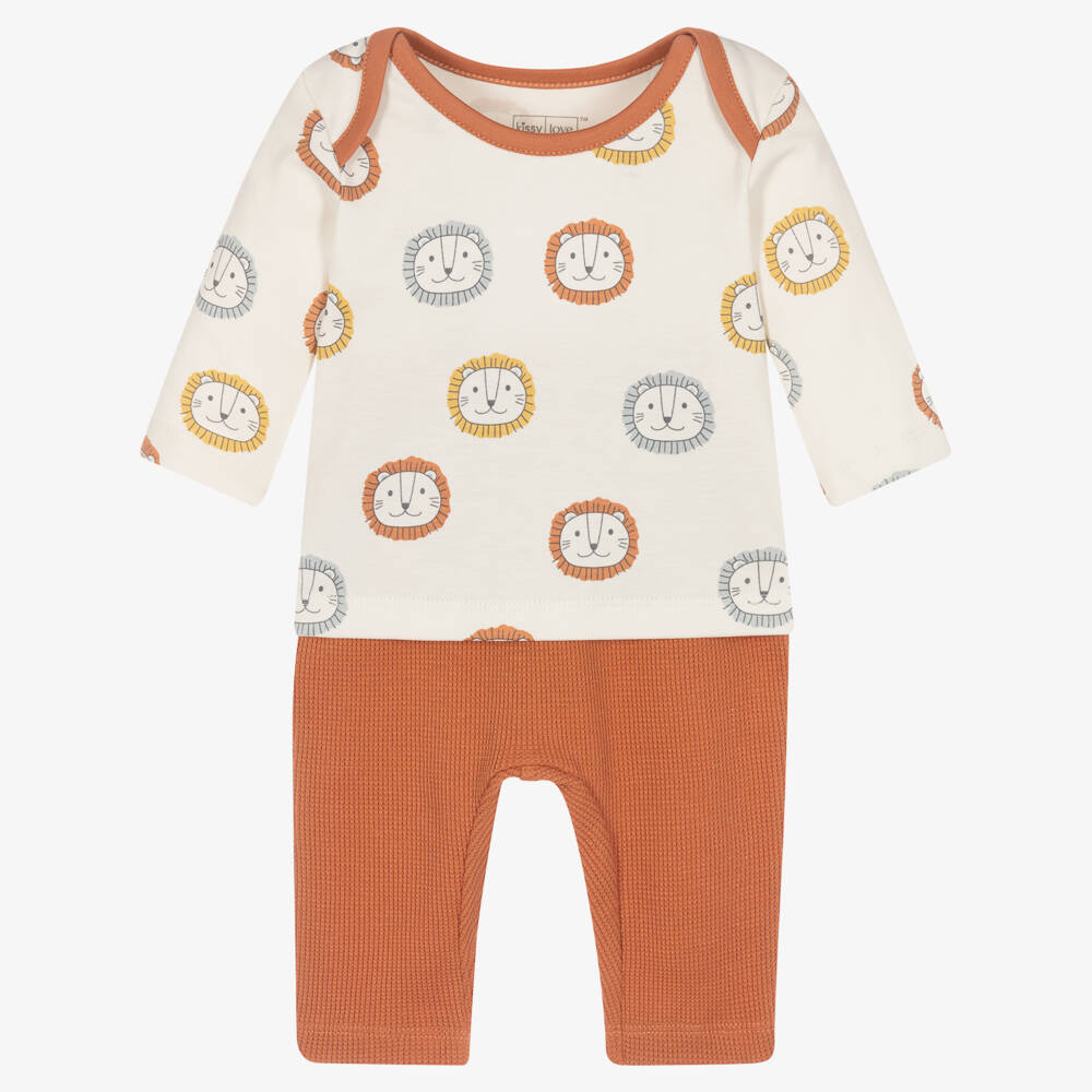 Ivory and orange trouser set for baby boys by Kissy Love, made in soft Pima cotton jersey. Designed with an envelope neckline, the ivory top has an adorable lion print in muted tones of blue, yellow and orange. The coordinating waffle jersey trousers have a gently elasticated waist for a comfortable fit on tiny tummies.