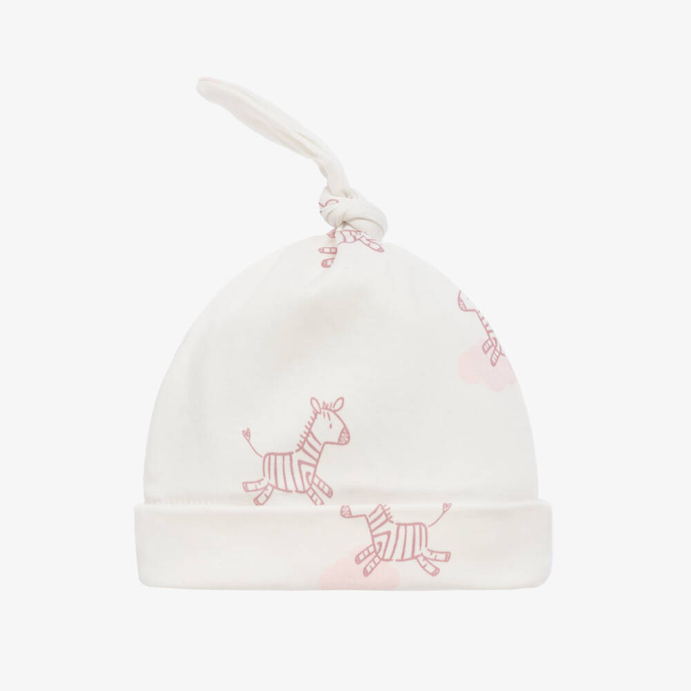 An adorable ivory hat for baby girls by Kissy Love, printed with sweet pink zebras and light pink clouds. In a cute knotted style, it is made from soft and stretchy Pima cotton jersey.