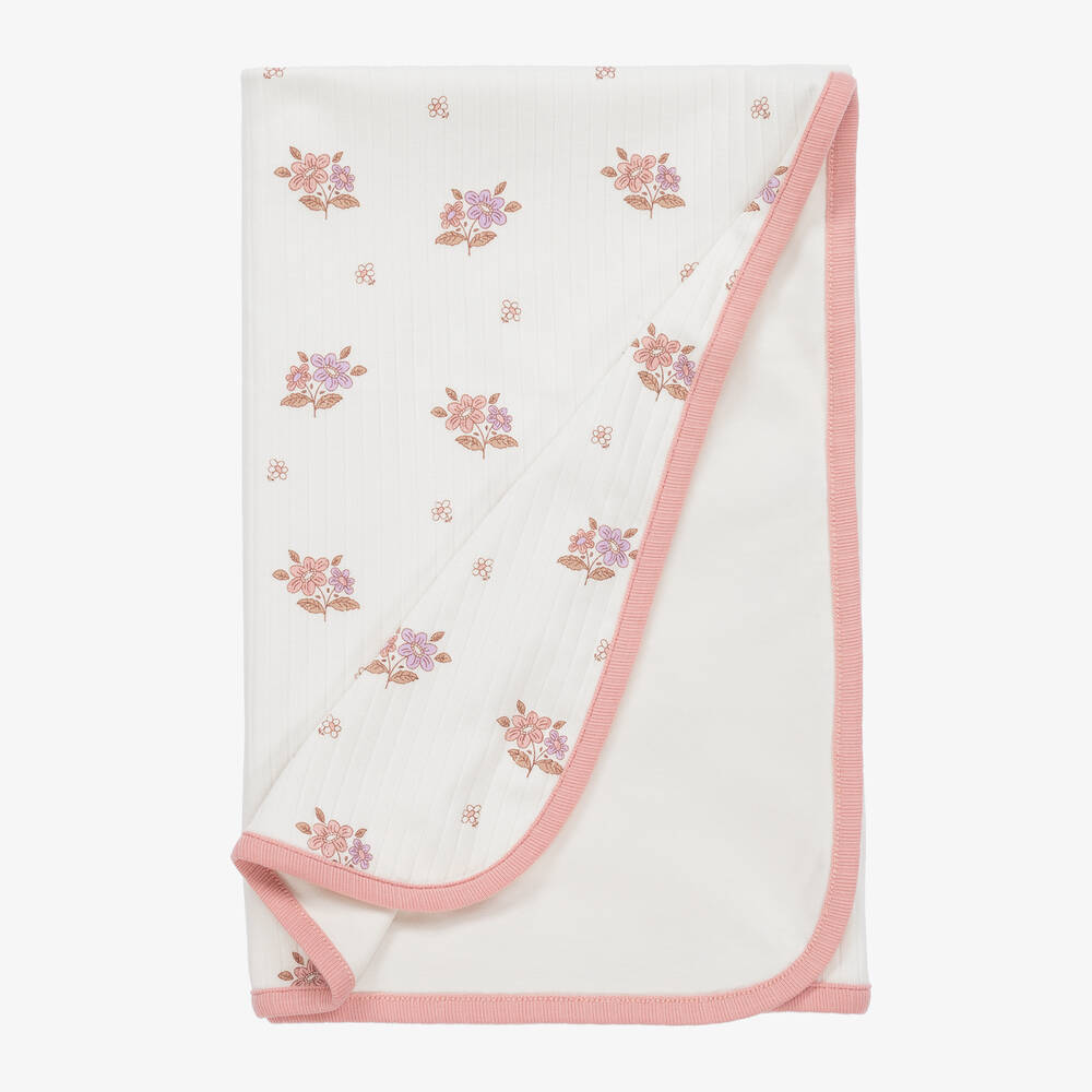 Pretty ivory blanket for baby girls by Kissy Love, printed with a sweet floral pattern. Gentle on delicate skin, it is made from a super soft and stretchy ribbed Pima cotton jersey with smooth jersey on the reverse side. A pink ribbed border adds a neat finish.