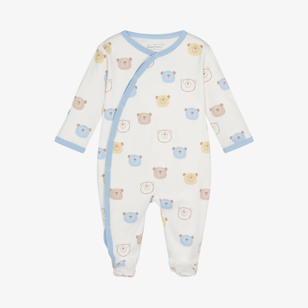 An adorable ivory babygrow for boys by Kissy Love. Made from soft Pima cotton jersey, it is printed with a cute teddy bear pattern and has blue ribbed trims. Fastening with poppers on the front, there are fold-over scratch mitts on smaller sizes.