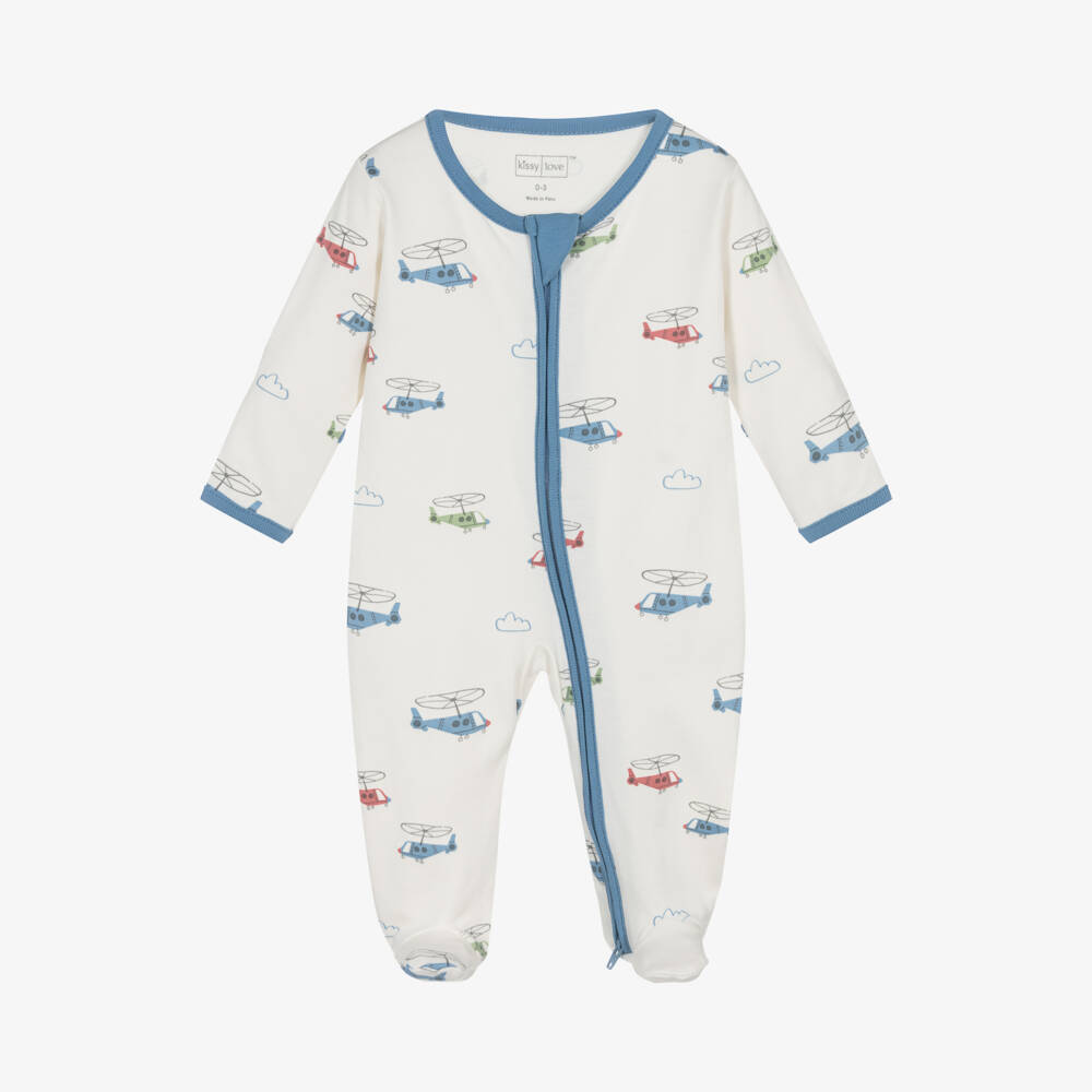 Patterned with a charming helicopter print, this ivory babygrow for boys is by Kissy Love. Made from soft Pima cotton jersey, there is a practical two-way zip fastening on the front with a protective chin guard. It has dusky blue ribbed trims and fold over scratch mitts on smaller sizes for added comfort.