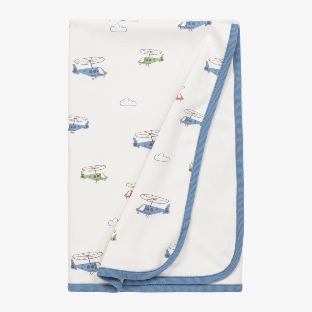 Printed with a fun helicopter pattern, this ivory blanket for baby boys is by Kissy Love. It has a blue ribbed border and is made in a double layer of super soft Pima cotton jersey that is gentle against delicate skin.