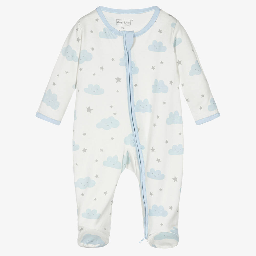Ivory Pima cotton babygrow for boys by Kissy Love. Kind and gentle on delicate skin, it has an adorable blue cloud and grey star print all-over, with co-ordinated blue piping trims. It fastens with a super easy-to-use front zip, that has a protective chin guard. Smaller sizes have useful fold-over scratch mitts.