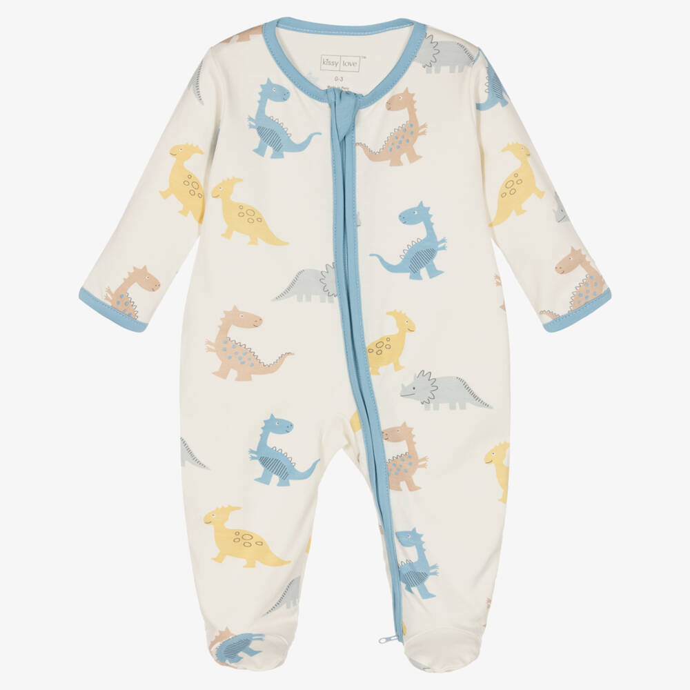 Lovely ivory babygrow for boys by Kissy Love made in super soft Pima cotton jersey. Kind and gentle against delicate skin, it has a cute dinosaurs print in shades of blue, yellow and beige and a contrast blue trim. This adorable babygrow has an easy-to-use front zip fastening, with a protective chin guard. Smaller sizes have useful fold-over scratch mitts.