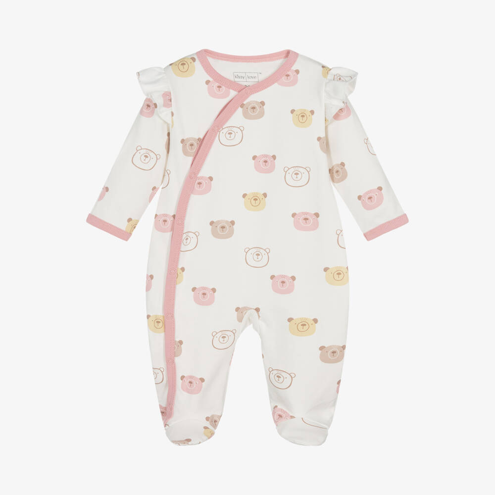 Super cute, this ivory babygrow for girls is by Kissy Love. Made from soft Pima cotton jersey, it is printed with an adorable teddy bear pattern and has pink ribbed trims. Decorated with pretty frills on the shoulders, it fastens with poppers on the front and has fold over scratch mitts on smaller sizes.