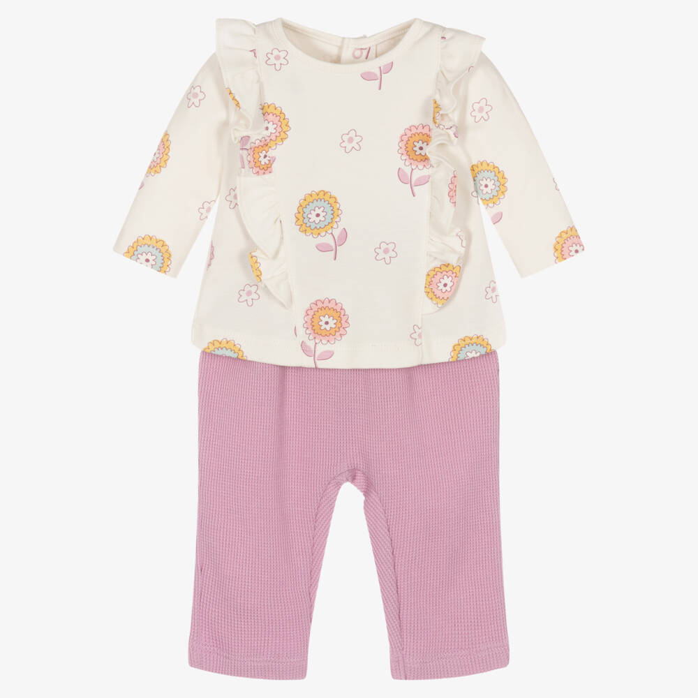 Sweet ivory and lilac purple trousers set for baby girls by Kissy Love, made in super soft and stretchy Pima cotton jersey. The ivory top has a pretty floral pattern in shades of pink, blue and yellow. There are ruffle trims on the front and useful popper fastenings on the back for easy dressing. The lilac purple trousers are made in a waffle effect jersey with a comfortable elasticated waistband.