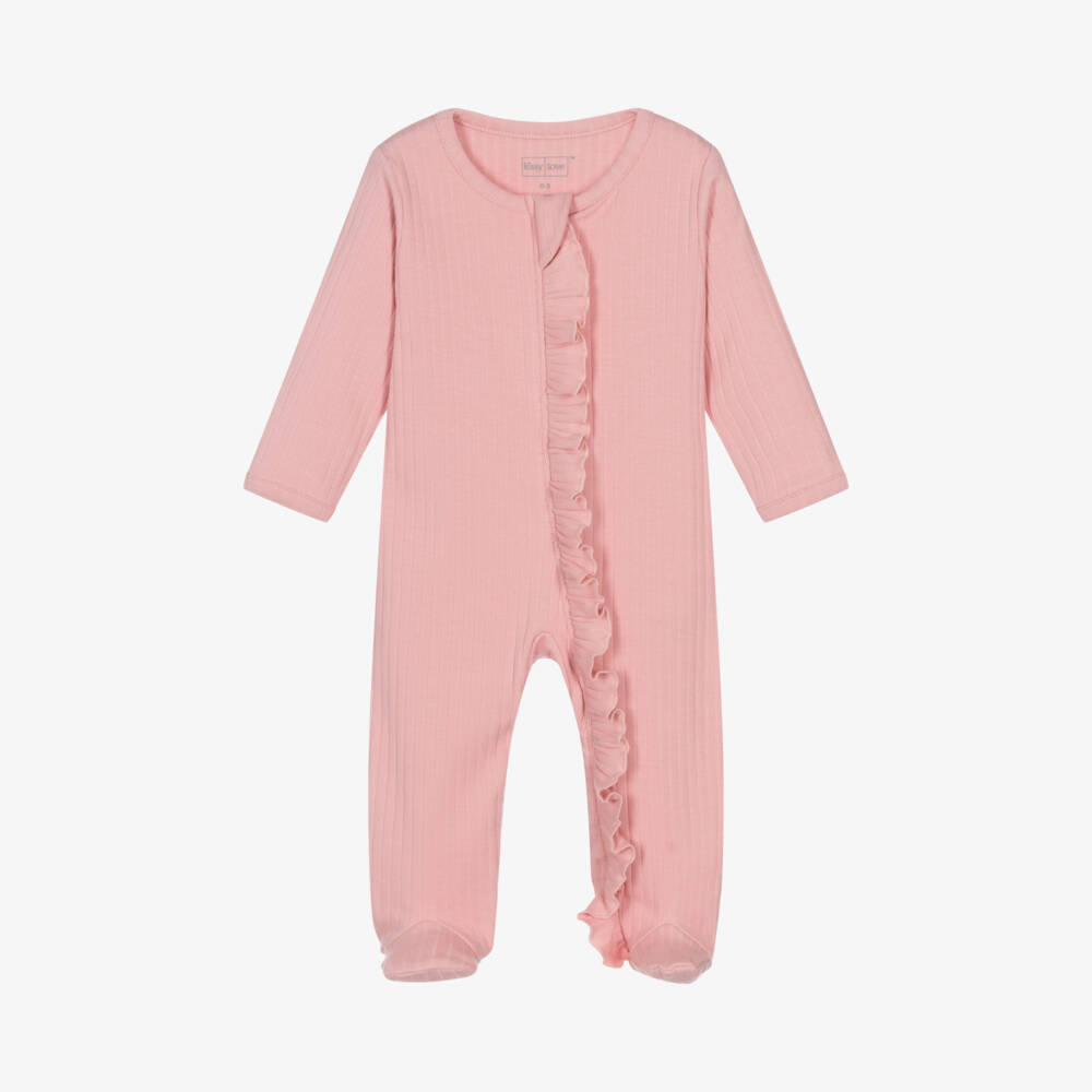 A lovely pink babygrow for girls by Kissy Love, made from soft ribbed Pima cotton jersey. The practical two-way zip fastening on the front has a chin guard and is concealed by a pretty frilled trim. Smaller sizes have fold-over scratch mitts on the cuffs for added protection.