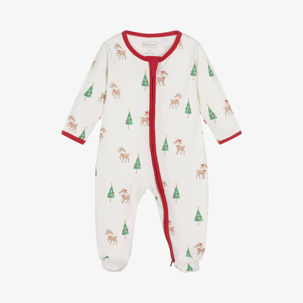 Great for the festive season, this ivory babygrow for boys and girls is by Kissy Love. Printed with a sweet reindeer and Christmas tree pattern, it is made from soft Pima cotton jersey and has contrasting red ribbed trims. There is a practical two-way zip fastening on the front, a protective chin guard, and fold-over scratch mitts on smaller sizes to help protect delicate skin.