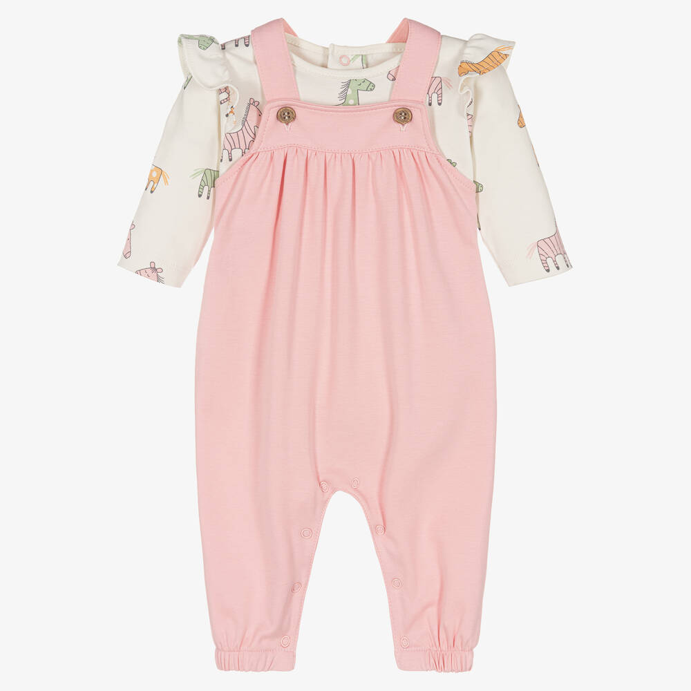 Ivory and pink dungarees set for baby girls by Kissy Love, made in super soft and stretchy Pima cotton jersey. The ivory bodyvest, has a cute zebra print in shades of green, pink and orange. It has popper fastenings on the back and between the legs and sweet ruffle trims on the shoulders. The pink dungarees have a gathered front and wooden effect button fastenings on the shoulder straps. They have an elasticated back for a comfortable fit and popper fastenings between the legs for easy dressing.
