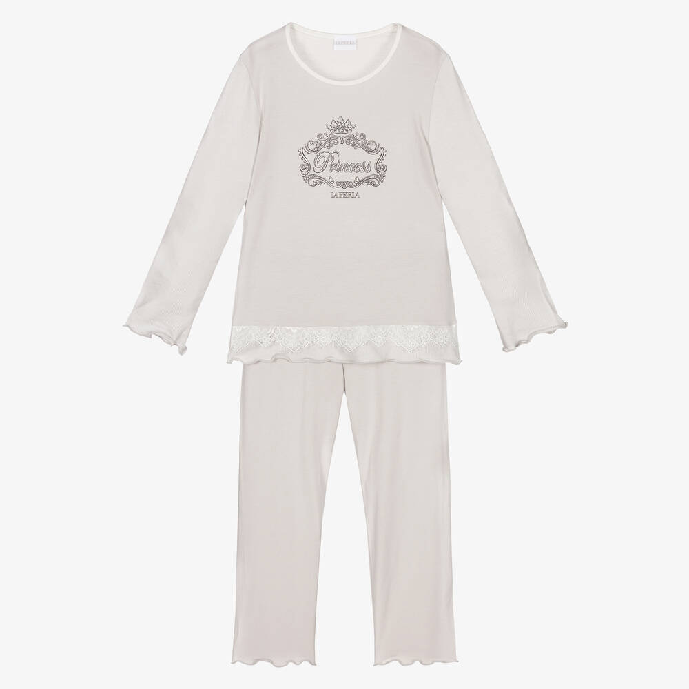 Light grey long pyjamas for girls by luxury Italian brand La Perla, made in super soft, lightweight modal jersey. The top has lightly ribbed sleeves and a Princess logo print on the front with sparkling diamantés. There is a pretty lace trim on the front of the hem. The plain grey bottoms have a comfortable elasticated waist.
