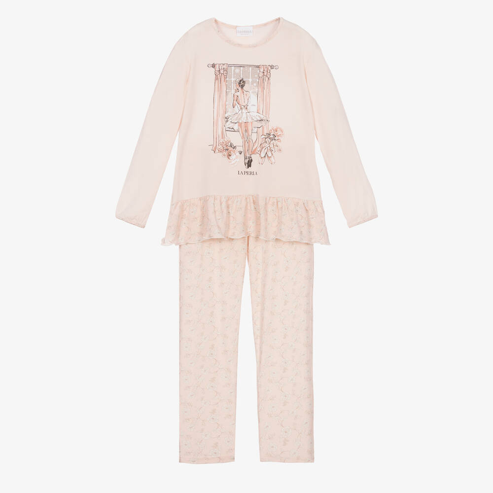 Blush pink long pyjamas for girls by luxury Italian brand La Perla, made in soft, silky and lightweight modal jersey. The top has a pretty ballerina themed print, with sparkly diamanté studs and a black logo print. It has a pink and white floral ruffle hem and trims. The matching floral print bottoms have a comfortable elasticated waistband.