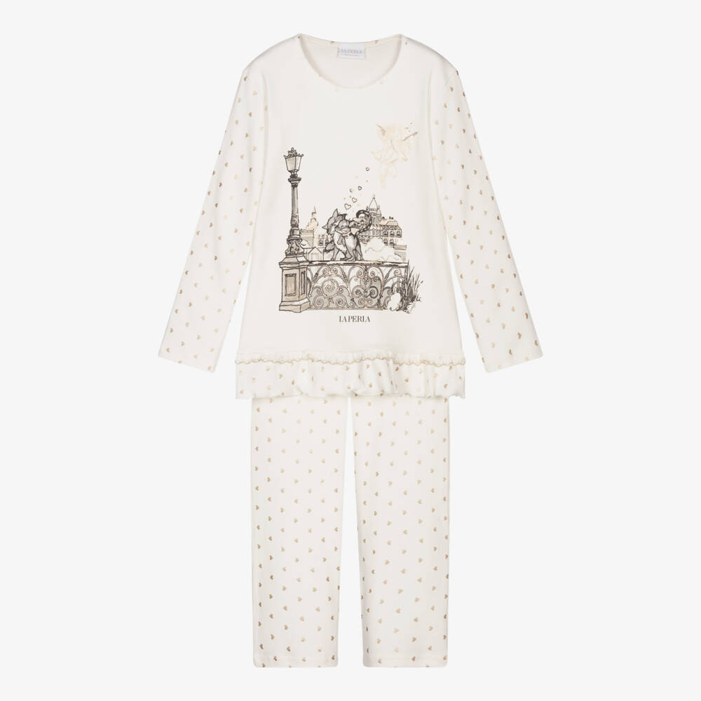 Girls ivory pyjamas from luxury brand La Perla, made in soft and stretchy cotton jersey. There is a grey and gold cat print on the top and a gold heart pattern on the sleeves and trousers. The top has the brand's logo printed in black on the front and a pretty ruffle hem. The long-length trousers have an elasticated waistband for a comfortable fit.
