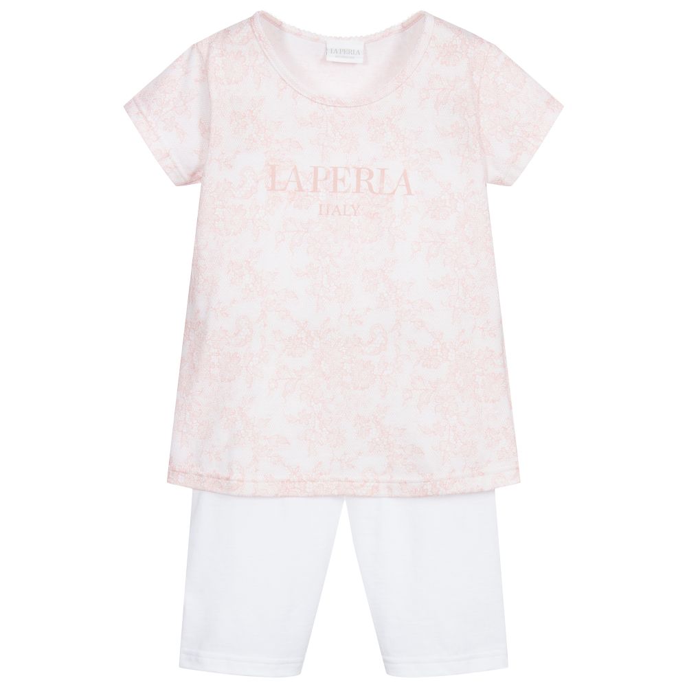 Girls pink and white short pyjamas by luxury brand La Perla, made in lightweight cotton jersey. The sleeveless top has a pretty lace print and the designer's name on the front.
