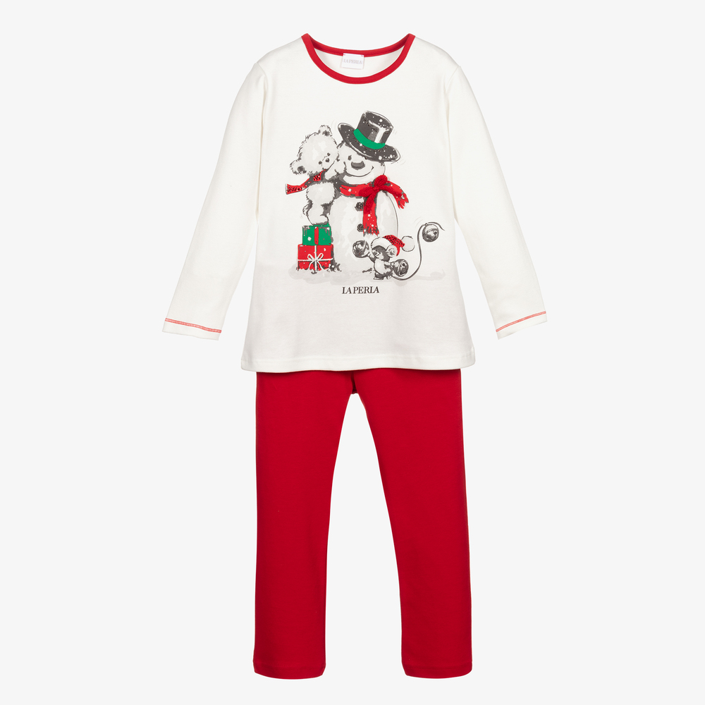 Ivory and red pyjamas for girls by luxury Italian brand La Perla, made in soft cotton jersey. The ivory top has a printed design on the front of a teddy bear and mouse building a snowman. There are diamanté details and a knitted bow trim. The red pull-on trousers have a comfortable elasticated waistband.