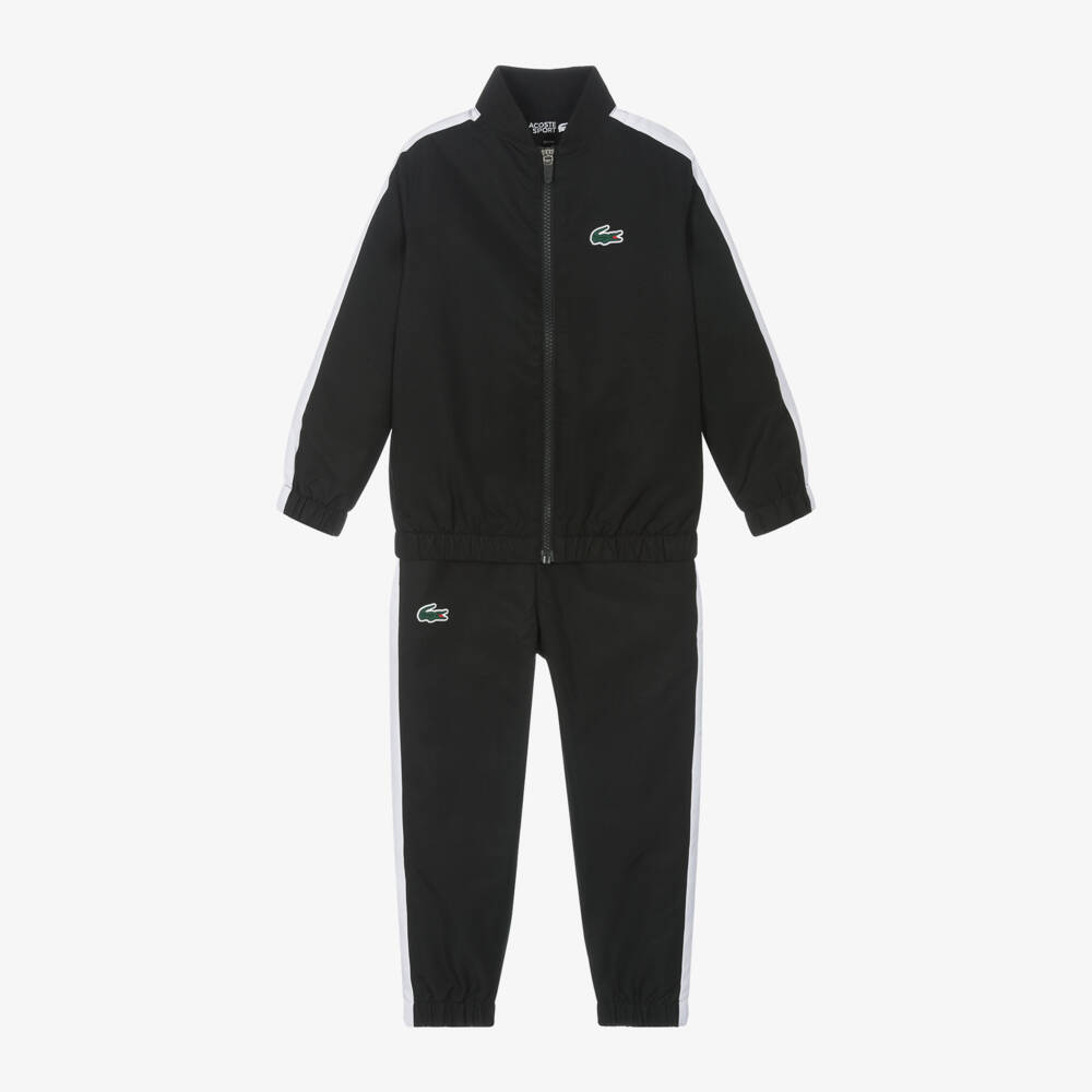 Black with white striped trims, this activewear tracksuit for boys is by Lacoste. The silky smooth diamond weave fabric is made from recycled material and is both lightweight and quick drying. Featuring a large white crocodile logo on the back, the zip-up top is lined in soft mesh for breathability, with a ribbed collar and zipped side pockets. Lined in soft jersey, the joggers have an elasticated waist with internal drawstring ties for an ideal fit. There are zipped zipped vents on the elasticated ankles to help with ventilation. Both pieces are trimmed with the brand's iconic green crocodile for a signature finish.