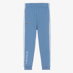 Navy blue joggers for boys by Lacoste, made in a mid-weight cotton blend, with a soft, fleecy inside. Casual and comfortable, they have lighter blue side panels, useful side seam pockets and an elasticated waistband with an internal drawstring. The brand's iconic crocodile logo can be seen on the front and a rubberised logo is printed on one leg, for a distinctive designer finish.