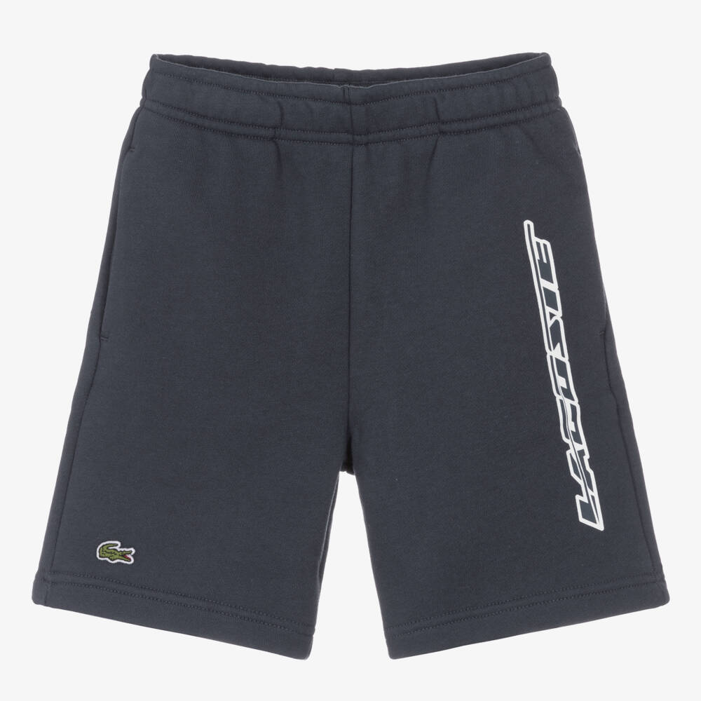 Blue-grey Mini-me shorts for boys by Lacoste, made in soft and comfy organic cotton jersey. These casual shorts have an elasticated waist with an inner drawstring tie, and useful side seam pockets. There is a white logo print down one leg, with the brand's signature crocodile sewn on the hem.