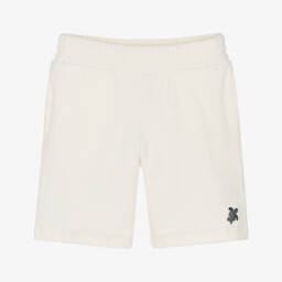 Ivory cotton blend shorts for boys by Lacoste, with contrasting tan brown panels on the sides. Made in soft, comfortable jersey with a cosy, fleecy inside, they have useful, concealed pockets on the front. There is an internal drawstring for a great fit. The signature green crocodile logo badge is sewn on one side, whilst bold branding is printed on the other. This product contains organic cotton and recycled polyester.