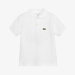 Classic white polo shirt for boys by Lacoste, made in soft and stretchy cotton piqué. It has a ribbed collar and cuffs, with button fastenings on the front and the brand's signature crocodile logo on the chest.