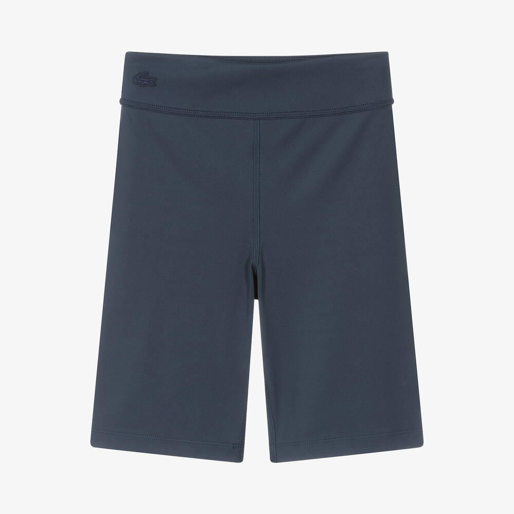 Sporty and comfortable, blue-grey cycling shorts for girls by French label Lacoste. Silky smooth and stretchy, they are made in recycled nylon with a rubberised crocodile logo on the gently elasticated waistband for a signature look. They are stylish and comfy to wear for