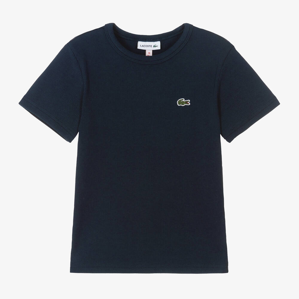 Navy blue T-shirt for older girls by Lacoste, made in soft and stretchy cotton jersey with an easy crew neck. This short-sleeved tee has a ribbed texture and is cut for a slim fit. The brand's green crocodile badge is stitched on the chest for a signature finish.