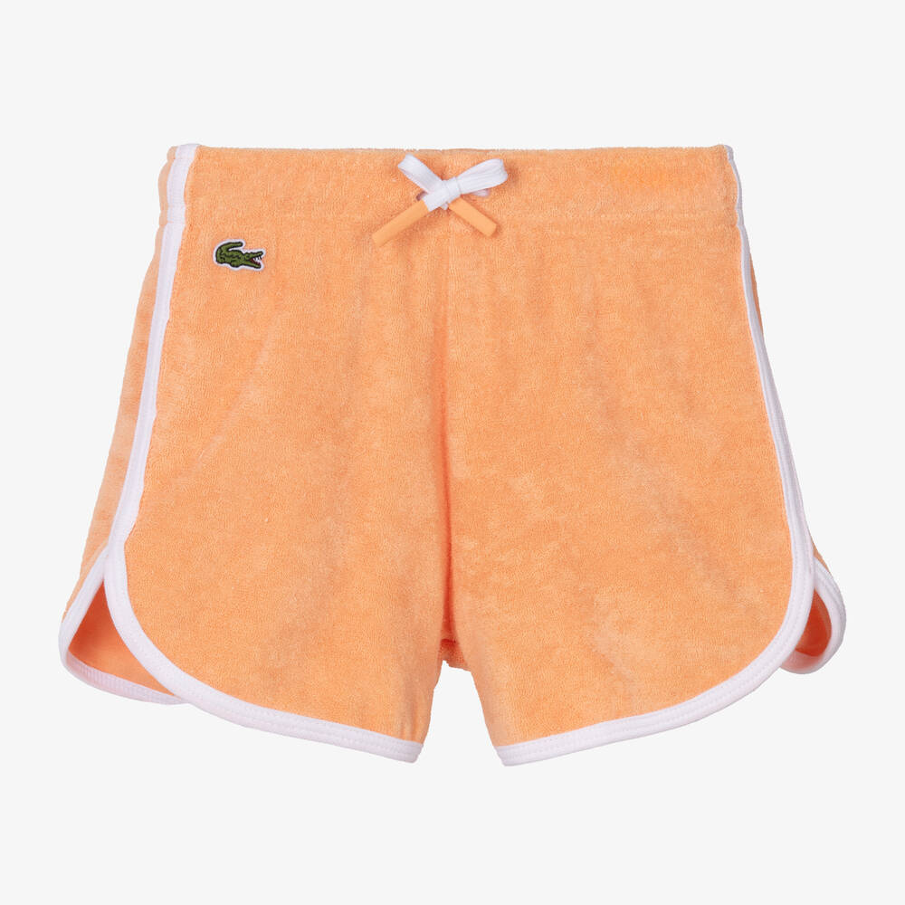 Girls pale orange shorts by Lacoste, made in cotton-blend towelling for comfortable, easy wear. These drawstring shorts have curved hems with contrast white trims for a retro, athletic look. The brand's iconic green crocodile patch is visible on the front, adding a signature touch. This item contains organic cotton and recycled material.