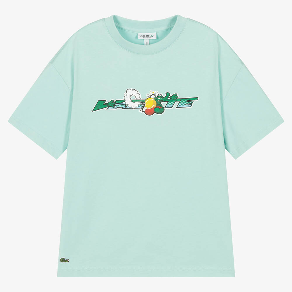 Green T-shirt for teen boys by Lacoste, with a cartoon-inspired logo print on the front. Made in soft organic cotton jersey, this essential piece has a classic crew neck and relaxed dropped shoulders. The iconic green crocodile logo is sewn on the hem for an added designer detail.