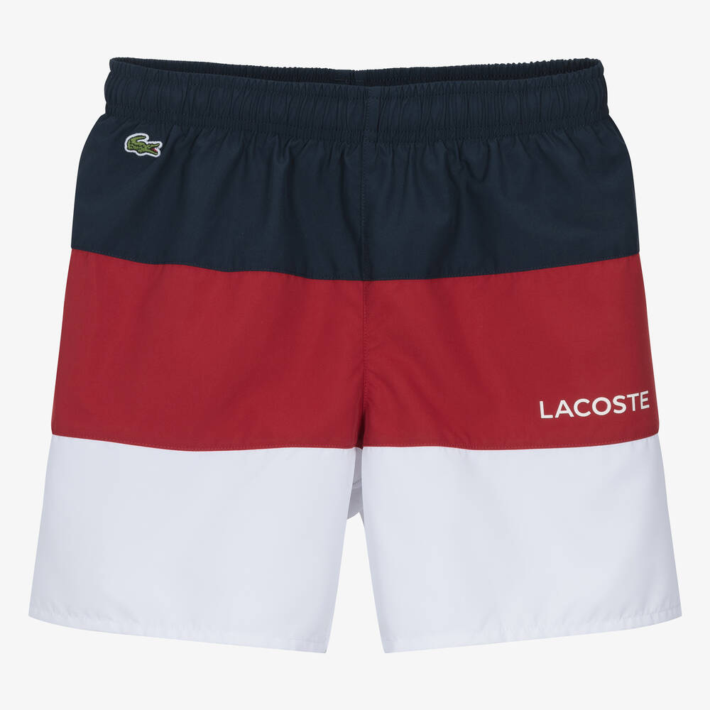 Colourblock swim shorts for teen boys by Lacoste, in a navy blue, red and white colourway. Made in silky-smooth fabric, these designer swim shorts have the famous crocodile appliqué and a bold white logo print on the front. The elasticated waist is adjustable with inner drawstrings, ensuring the most comfortable fit. These shorts contain recycled materials.