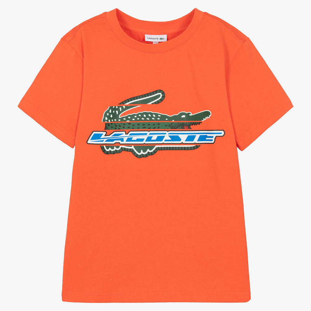 Orange T-shirt for teen boys by Lacoste, with a racing-themed logo print on the front that incorporates the iconic crocodile. This casual cotton tee has short sleeves, a classic crew neckline and a green crocodile patch on the back.