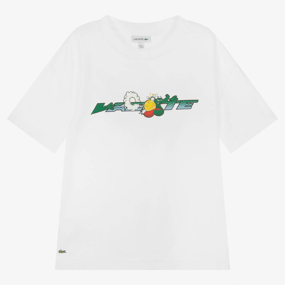 White T-shirt for teen boys by Lacoste, with a cartoon-inspired logo print on the front. Made in soft organic cotton jersey, this essential piece has a classic crew neck and relaxed dropped shoulders. The iconic green crocodile logo is sewn on the hem for an added designer detail.