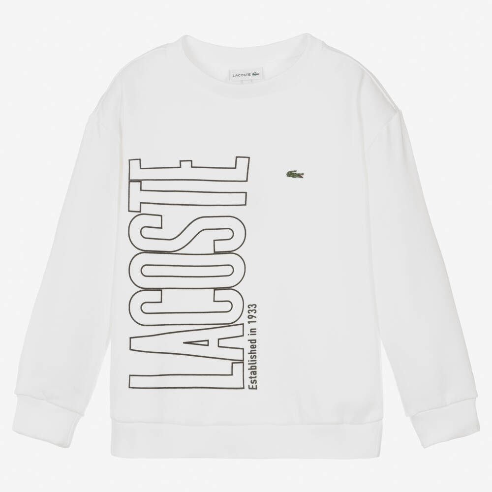 Off-white sweatshirt for teen boys by Lacoste, made in comfortable mid-weight cotton jersey with a fleecy inside. It has a large logo print on the front and the brand's iconic green crocodile logo on the chest. Ideal for casual wear, it has a classic crew neck and ribbed trims for extra cosiness.